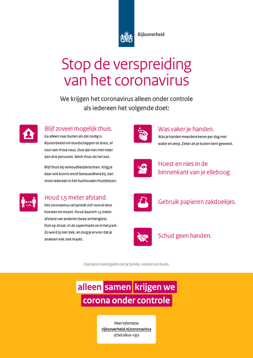 In Nederland gelden op dit moment een aantal maatregelen die de verspreiding van het coronavirus tegen gaan. De essentie van de aanpak is: het virus maximaal controleren waarbij vooral kwetsbare groepen worden beschermt. Een aantal maatregelen die voor iedereen gelden zijn: