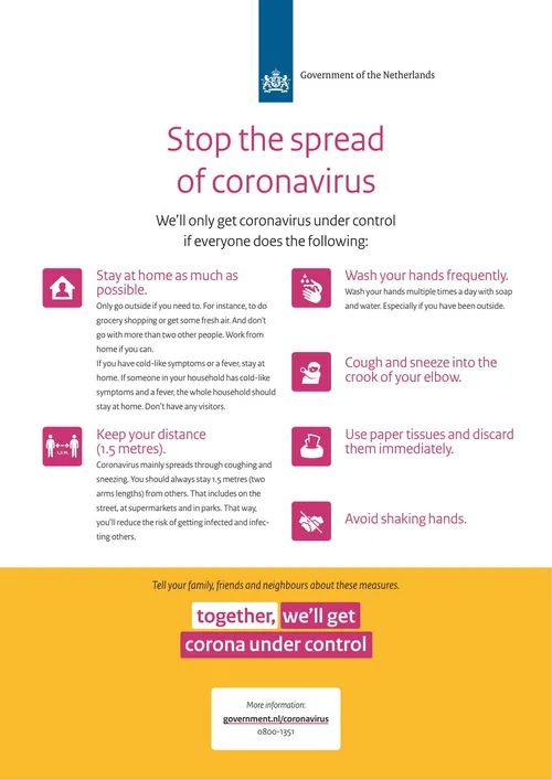 In the Netherlands, a number of measures are currently in place to prevent the spread of the coronavirus. The essence of the approach is: maximum control of the virus, especially protecting vulnerable groups. Some measures that apply to everyone are: