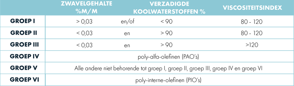 De API groepsindeling bestaat uit een vijftal groepen. Er zijn een drietal groepen van typen minerale basisoliën gedefinieerd op basis van zwavelgehalte, mate van verzadigdheid en viscositeitsindex. De vierde groep omvat een bepaald type synthetische grondstof genaamd poly-alfa-olefinen (PAO’s). PAO’s hebben, in vergelijking tot minerale oliën, minder goede hechtende eigenschappen, lossen minder goed op in additieven en is compatibiliteit (mate waarin systemen samen te gebruiken zijn) met afdichtingsmaterialen een probleem. De vijfde en tevens laatste groep, volgens de API indeling, omvat alle producten die niet onder te brengen zijn in de eerste vier groepen.