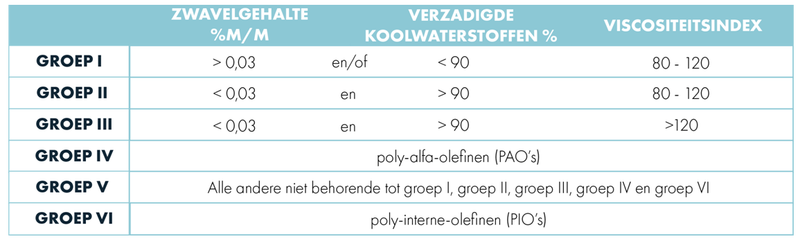 Deze groepsindeling bestaat uit een vijftal groepen. Er zijn een drietal groepen van typen minerale basisoliën gedefinieerd op basis van zwavelgehalte, mate van verzadigdheid en viscositeitsindex. De vierde groep omvat een bepaald type synthetische grondstof genaamd poly-alfa-olefinen (PAO’s). Kenmerkende eigenschappen van PAO’s zijn onder andere dat ze een hogere viscositeitsindex hebben dan de meeste minerale oliën, een laag vloeipunt en een lage vluchtigheid hebben en een hoge thermische stabiliteit en oxidatiestabiliteit hebben bij hoge temperatuur. PAO’s hebben, in vergelijking tot minerale oliën, minder goede hechtende eigenschappen, lossen minder goed op in additieven en is compatibiliteit (mate waarin systemen samen te gebruiken zijn) met afdichtingsmaterialen een probleem. De vijfde en tevens laatste groep volgens de API indeling omvat alle producten die niet onder te brengen zijn in de eerste vier groepen.